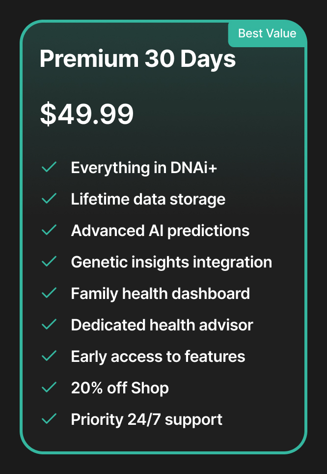 Designed for those who demand the deepest insights and long-term security for their family’s wellness, this premium lifetime plan combines cutting-edge AI predictions with dedicated human support.